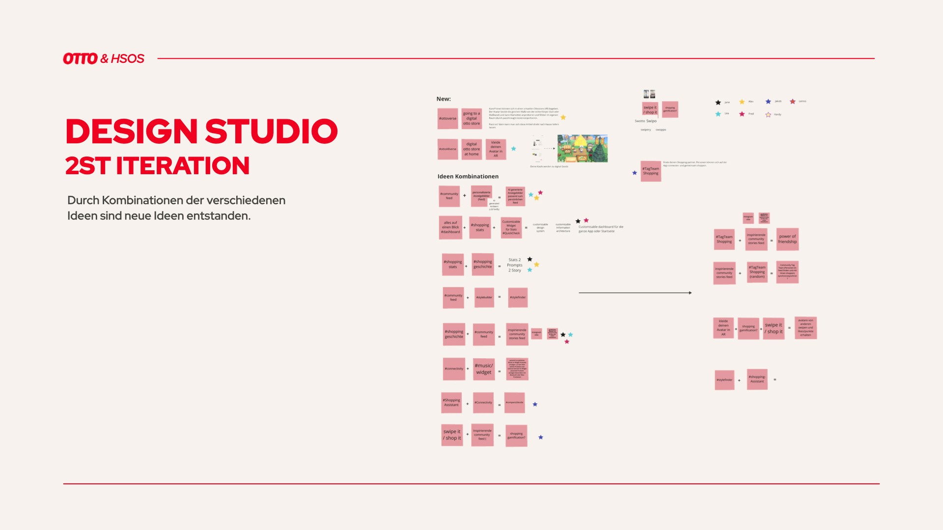 Mit unterschiedlichen Design-Methoden verfeinerten wir die Ideen immer weiter. Durch Workshops, Feedback-Runden und erste Tests erarbeiten wir zwei Konzepte heraus. Eines davon war OTTO mate, das soziale Interaktionen in den Fokus rückt.