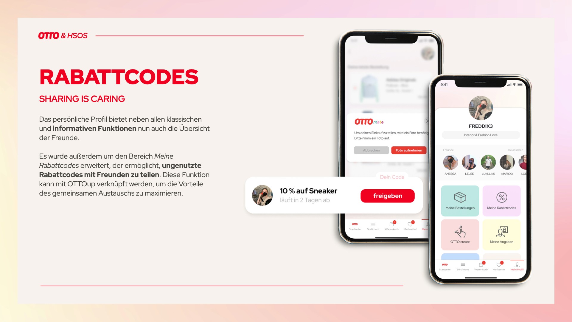 Wir entwickelten OTTO mate mit Features wie dem Entdecken neues Produkten auf Basis von dem Umfeld und Freunden, Teilen von Empfehlungen, Rabattcodes und Wunschlisten. Durch einen qualitativen Usability-Tests validierten wir, welche sozialen Features tatsächlich genutzt werden und arbeiteten daran, diese nahtlos in die bestehenden User Journeys einzubetten.